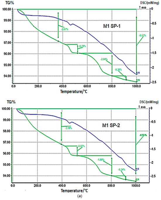 Thermogravimetric measurements were performed using a simultaneous thermal analyser—STA 449 F3 Jupiter (NETZSCH GmbH, Selb, Germany). An analytical sample of approximately 30 mg was introduced into an alumina crucible. The crucible was fitted with a lid to stabilise the atmosphere above the sample during measurement. Once the mass of the specimen had been determined, the crucible was placed on the DSC-TG carrier and the whole was put into the furnace. The temperature programme included specimen stabilization at 30 °C and heating up to 1000 °C at a rate of 10 °C/min.