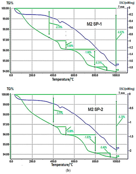 Thermograms of RPC samples (green curves) (a) with SP-1 and SP-2 obtained after three-stage mixing procedure (M1) and (b) with SP-1 and SP-2 obtained after four-stage mixing procedure (M2) after 2 days of curing.