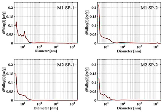 Pore volume distribution vs. pore diameter in the M1 SP-1, M1 SP-2, M2 SP-1 and M2 SP-2 RPC samples after 28 days of hydration.