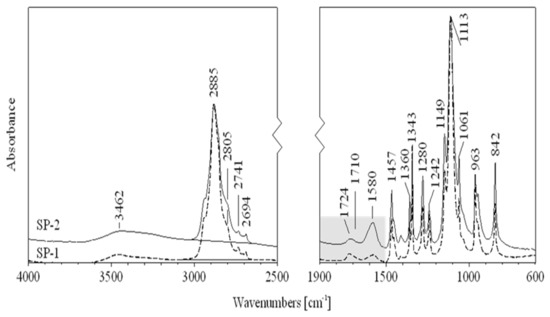 Both tested superplasticizers (SP-1 and SP-2) contain almost identical functional groups and structural fragments, but different contributions of individual groups. This is clearly reflected from relative intensities of individual peaks in the carbonyl range (1800–1350 cm−1, see Figure 10). Comparison of ester peak intensity (O=C-O-CH2- at 1724 cm−1) and acid peaks (O=C-OH at 1710 cm−1) of both superplasticizers shows that SP-1 contains ca. 50% more ester and ca. 20% more acid groups in its molecules than SP-2, which contains four times more metal carboxylates (salts of R-COO-Me+ type).