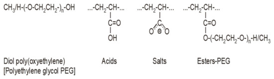 Chemical functional groups present in the SP structure, as listed (Table 6), were identified based on Correlation Charts included in handbooks for FTIR spectrum analysis [53,54,55]. Based on functional groups identified in IR spectra, a general structure of the superplasticizer contains the structural fragments, presented in Figure 11.