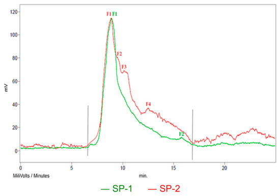 The shape of the GPC chromatographic curves (Figure 12) shows that the SP-2 superplasticizer, apart from the main polymer fraction (F1) derived from the polyacrylate copolymer with poly(oxyethylene-PEG), i.e., (poly(PEG acrylate)), contains two other polymer fractions (F2 and F3) in a significant amount (Table 9), derived from free poly(oxyethylene). Fraction F4 is not a polymer; it belongs to a low-molecular substance (Mw = 311 g/mol). The free, unreacted poly(oxyethylene glycol) PEG remaining in the post-reaction system during the synthesis of polyacrylic superplasticizers is not removed from the reaction environment, as it plays a positive role in shaping the properties of the concrete mix. Some studies [60,61,62,63] show that free PEG can cause a positive effect on the process of cement hydration and concrete maturation. Hydrated oxyethylene chains may contribute to the deflocculation of cement grains, which may lead to increased liquefaction of the concrete mix. On the other hand, PEG in water increases the viscosity of the environment due to the hydration of oxyethylene groups; therefore, the leachability of the concrete mix decreases. PEG is also a self-curing concrete agent. In this case, water from the dehydration of PEG polyether chains is used in the cement hydration process in concrete.