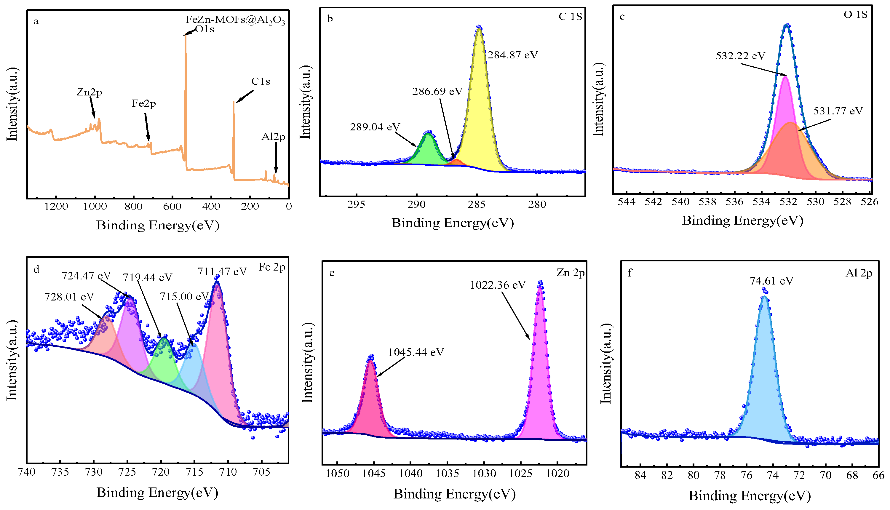 Figure 6. The XPS spectra of FeZn-MOFs@Al2O3: (a) the full spectra of FeZn-MOFs@Al2O3, (b) the C 1s spectra, (c) the O 1s spectra, (d) the Fe 2p spectra, (e) the Zn 2p spectra, (f) the Al 2p spectra.