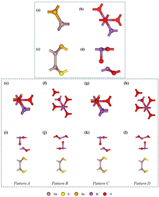 Top and side views of the unit cells of Ga2SSe monolayer (a,c); Bi2O3 monolayer (b,d); Janus Ga2SSe/Bi2O3 vdW heterojunctions, distinguished by the element type on both sides of the vdW gap as follows: Pattern A (e,i), Pattern B (f,j), Pattern C (g,k), and Pattern D (h,l).