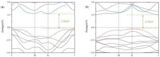 The of Ga2SSe and Bi2O3 monolayers were obtained by cleaving the hexagonal Ga2SSe and Bi2O3 crystals along the (001) direction. The optimized structures of Ga2SSe and Bi2O3 are presented in Figure 1a–d. The lattice constants for Ga2SSe and Bi2O3 monolayers were calculated to be 3.71 Å and 3.87 Å, which align well with earlier reports [52,53].The small lattice mismatch of 4.2% between Ga2SSe and Bi2O3 suggests their capability to establish a stable heterojunction within the two-dimensional plane. Owing to the structural asymmetry of the Ga2SSe and Bi2O3 monolayers, four distinct heterojunction configurations were constructed. These configurations vary based on the chemical element positioned on either side of the van der Waals gap, as shown in Figure 1e–l, and are designated as patterns A, B, C, and D. The electronic energy band structures of Ga2SSe and Bi2O3 monolayers were calculated using the HSE06 hybrid functional, as shown in Figure 2a,b. The results indicate that both Ga2SSe and Bi2O3 monolayers are indirect bandgap semiconductors, with bandgaps of 2.95 eV and 2.76 eV. These findings align with previous reports [54,55].