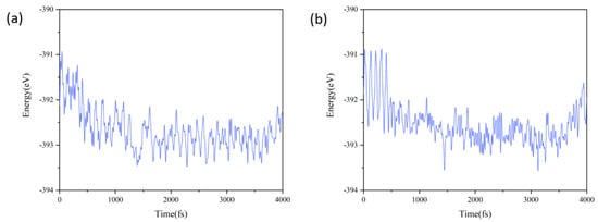 Fluctuations of the total free energy of (a) pattern A and (b) pattern C heterojunctions throughout the AIMD simulations.