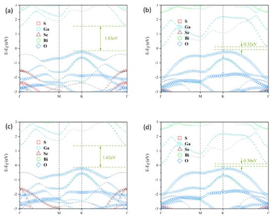 Atom-projected band structures of Janus Ga2SSe/Bi2O3 vdW heterojunctions computed using the HSE06 functional for pattern A (a), pattern B (b), pattern C (c), and pattern D (d), as defined in Figure 1. The Fermi energy is shifted to 0 eV.