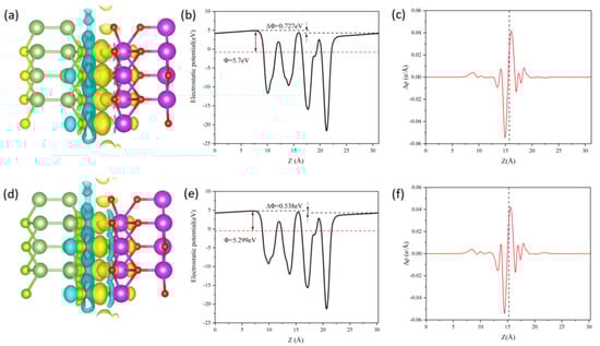 In order to determine the direction of the electric field and charge transfer, the electrostatic potential of the pattern A and pattern C heterojunctions was analyzed along the z-axis [63]. The findings are presented in Figure 5b,e. Owing to the difference in vacuum energy levels, the pattern A and pattern C heterojunctions exhibit electrostatic potential differences of 0.727 eV and 0.538 eV, respectively. It is clear that the Bi2O3 layer possesses a lower potential than the Ga2SSe layer, causing electrons to migrate from the Ga2SSe layer to the Bi2O3 layer. This is further validated by the planar-averaged electron density difference, as depicted in Figure 5c,f. The planar-averaged electron density difference was determined by integrating the in-plane CDD, following the equation [62]:
