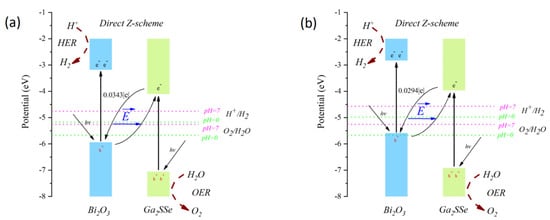 In the past few years, two-dimensional materials have gained significant attention in photocatalysis due to their distinctive physicochemical properties [11,12]. Among these, transition metal chalcogenides (TMCs) have emerged as particularly effective photocatalytic materials owing to their tunable band gaps [13,14], high carrier mobility [15,16], and substantial specific surface areas [15,17]. Metal oxides are also efficient photocatalysts for water decomposition to produce hydrogen, thanks to their excellent light absorption and electron-hole pair generation capabilities [18,19]. Gallium selenide sulfide (Ga2SSe), for example, demonstrates considerable promise for photocatalytic applications due to its unique electronic structure, which confers upon it remarkable visible light absorption properties [20]. R. da Silva et al. demonstrated that the Janus Ga2SSe monolayer has a stable structure, an indirect band gap, and low exciton binding energy. These features, along with efficient electron-hole separation and unique electronic alignment, make Ga2SSe highly suitable for photocatalytic water splitting and hydrogen generation [21]. Concurrently, bismuth oxide (Bi2O3), a well-established metal oxide photocatalyst, exhibits remarkable activity in photocatalytic reactions. P. Riente et al. explored the structure and electronic properties of α-Bi2O3 and β-Bi2O3 using first principles methods, and their findings aligned well with experimental data. Their photocatalytic activity arises from their narrowed band gaps, Bi 6s—O 2p hybridized orbitals, and red-shifted light absorption edges. Their optical properties highlight the potential of these polymorphs for efficient water splitting [22].