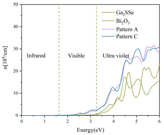 Optical absorption spectra of the Ga2SSe monolayer, Bi2O3 monolayer, and Ga2SSe/Bi2O3 vdW heterojunctions (pattern A and pattern C) calculated using the HSE06 functional. The vertical blue dotted lines delineate the boundaries of the visible wavelength region.