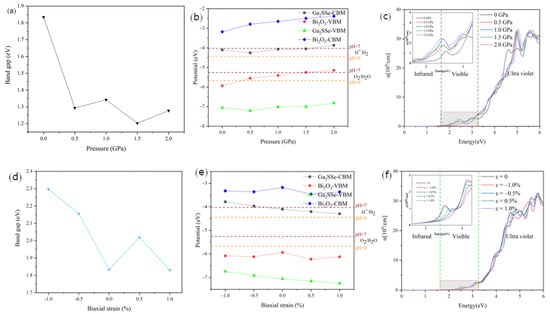 (a) Band gap, (b) band edge positions, and (c) absorption spectra of the Ga2SSe/Bi2O3 (pattern A) vdW heterojunction under different pressures. (d) Band gap, (e) band edge positions, and (f) absorption spectra of the Ga2SSe/Bi2O3 (pattern A) vdW heterojunction under biaxial strain. The insets in (c,f) feature an enlarged view of the visible region.