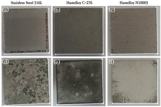 Stainless steel 316L (SS316L), Hastelloy C-276 (C-276), and Hastelloy N10003 (N10003) with the compositions shown in Table 1 (supplier provided) were purchased from Daeheung Welltech® (Ulsan, Republic of Korea), an affiliate of Haynes® (Westlake Village, CA, USA). All corrosion tests were conducted after cutting the metal into pieces that were 1 cm in width and 1 cm in length.