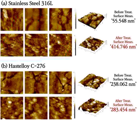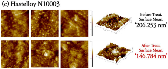 SS316L has a native Cr2O3 oxide protective layer, while C-276 and N10003 have dense Ni–Mo–Cr layers instead of metal oxides on their surfaces. Ni–Mo–Cr is a corrosion-preventing layer similar to Cr2O3. However, the reaction of the metal ions on the surfaces with molten salt causes the protective layers to disappear. Elements with low Gibbs free energy react preferentially with Cl and are eluted. As shown in Figure 1, the reactions occur in the order of Cr > Fe > Ni > Mo [23]. The alloy changes after the corrosion of the structural materials in the ClNaK eutectic salts were visually observed (Figure 2). Figure 3 shows SEM images of the surface grain shapes in the three alloy candidates at 1000× magnification. Figure 3d–f shows that the surface grain size changed considerably after the corrosion test. In addition, C-276 in Figure 3e exhibited an irregular surface state without distinct surface grain boundaries. Because corrosion begins with damage to the surface, this result can be used to predict the degree of corrosion in advance. Owing to the challenges in obtaining information about the entire sample from SEM results, the mean surface thicknesses before and after the corrosion of nine substrates were determined using AFM. The changes in the surface roughness are listed with five significant figures in Figure 4, and the mean value of the nine substrates is listed with six significant digits. Figure 4a shows that the surface thickness of SS316L increased by approximately 8 times from 55 to 414 nm. Compared to the SEM results, more grain boundaries were present on the surface. This proves that different reactions occurred as the substrate surface was being damaged and that these reactions covered the surface. In contrast, Figure 4b shows that the mean surface thickness of C-276 increased slightly by 15% and grain aggregation occurred, while Figure 4c shows that the surface thickness of N10003 decreased from 206 to 146 nm, proving that the surface grain was damaged and eluted as molten salt.