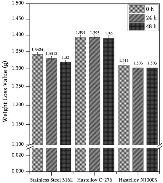 It was reported that the lifecycles of structural materials can be predicted from their mass loss and corrosion rates measured over long periods of several years (mmpy, millimeter penetration per year) [24,25]. Figure 5 shows the mass changes calculated based on the averages of nine alloy samples with 0.005 g error bars. Only SS316L lost mass after corrosion at high temperatures in an atmospheric environment after both 24 and 48 h. The corrosion rates of Ni and Fe alloy metals are given by