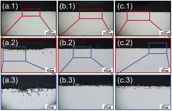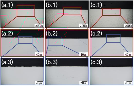 OM images of polished alloy cross-sections before salt immersion test. Structural material candidates: (a) SS316L, (b) C-276, and (c) N10003. Magnification (1): ×140, (2): ×700, and (3): ×2000.
