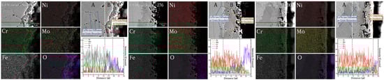 Grain boundaries provide the optimal pathways for the movement of bulk ions to the surface. The ×2000 magnification OM image in Figure 6 shows that the interior of the alloy had a smooth cross-section before the molten salt reaction. After corrosion, SS316L was corroded from the surface to the bulk as shown in Figure 7(a.1–a.3). Figure 7(a.3) shows that the 6–10 μm thick surface protective layer was damaged, and an oxidation-corrosion layer was formed, and that corrosion began to penetrate into the bulk in the shape of a tree branch. In comparison, in the corresponding results for C-276 and N10003 shown in Figure 7(b.3) and Figure 7(c.3), respectively, surface corrosion was induced, but deep penetration did not occur, and grain boundaries can be observed in the OM images. SEM–EDX analysis of the cross-sections was performed to confirm the exact thickness of the corrosion layer and determine the distribution of Ni, Mo, and Cr at the interface between the surface and matrix based on the thickness of the oxide corrosion film (Figure 8). Significant element loss was observed at the interfaces between the surfaces and the matrices of the candidate alloys. Figure 8a shows the degree of corrosion in the Fe-based alloy. The triple point of the grain boundary was located in the corrosion sublayer and identified as a diffusion path for Fe and Cr. The corrosion diffusion distance corresponding to Zone B in Figure 8a was approximately 30 μm. The SEM–EDX results indicate sporadic regions with interfacial pitting corrosion in the alloys. The line EDX results indicate the quantities of the imaged elements. However, because of the heavy noise present, only the general trends are referred to in the following. In SS316L, in which sporadic pitting corrosion was evident, the density of the main elements decreased with decreasing distance from the surface because of the elution of Cr and Fe ions. Figure 8b shows the SEM–EDX results for corroded C-276. The grain length and size in the section with the lowest density were determined. Line-EDX was performed on the protective diffusion barrier layer, and Zone B was determined to be approximately 10 μm thick. This made it possible to observe significant changes in the pore layer and the grain boundaries of the rapidly collapsed ions on the surface. However, Ni elution did not induce changes in the Ni and Mo ions in Zone B as rapid as those in Zone A. Zone A corresponds to the characteristic Ni–Mo–Cr layer of C-276, which prevented internal penetration. SS316L and C-276 were selected to confirm the effects of the Cr content on the corrosion behavior. Figure 8c confirms that there was a large diffusion distance from the Cl and O corrosion layer to the protective layer. Large voids that penetrated deeply into the material are visible. The grain boundary diffusion distance was found to reach up to 20 μm. It is challenging to distinguish Zones A, B, and C in N10003, and there was lower internal pitting corrosion compared to that in C-276.