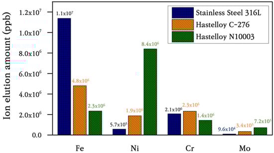 Using Equation (1), the yearly corrosion rates of SS316L, C-276, and N10003 were obtained as 5.268, 0.8211, and 1.647 mmpy, respectively. These corrosion rates show that the main elements in the structural materials were lost through chloride formation. The corrosion rate can also be calculated using the ion activation acceleration coefficients of Cr, Fe, and Ni, which are the main elements present in the alloys. A formula based on the activation energy and acceleration factor was used to evaluate the stability of the alloys based on their reactivity with chlorine during corrosion. The chlorine compounds in the Ni and Fe alloy metals were formed through the reactions listed below. The acceleration factor can be obtained from the maximum activation energy amongst Fe, Cr, Mo, Ni, and other elements using Equation (2). Cr3+, Ni2+, and Fe2+ ions react with Cl in an atmospheric environment containing O2 and H2O. The compounds formed upon ion desorption react readily with O in an unshielded air environment. Ion elution occurs through chlorination, as listed in the following reactions: