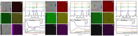 XPS analysis results for Ni, Cr, Mo, Fe, and O contents in (a) SS316L, (b) C-276, and (c) N10003. Deep etching sputtering was used to determine the differences between the elements present on the surface and in the bulk from the depth profile surface. Plasma etching was performed from 0 to 1800 s.