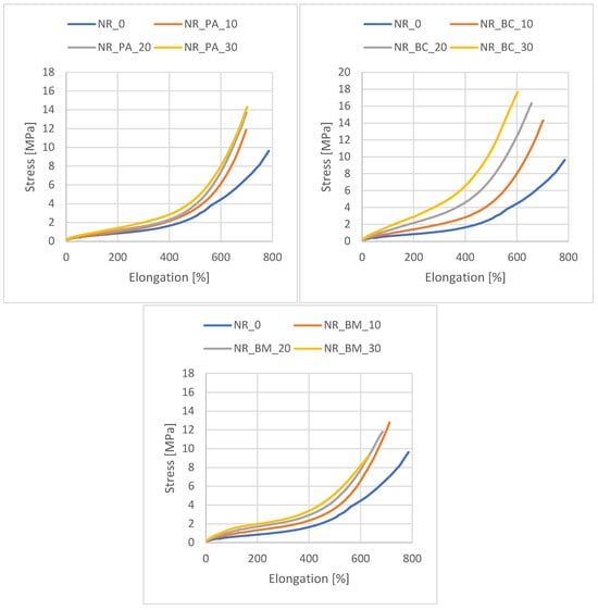 Table 5 shows the effect of the bioadditives used on the functional properties of the vulcanizates produced. These properties were assessed based on changes in crosslinking density (determined from equilibrium swelling tests), mechanical properties (stress at 300% of elongation), and sample hardness. The stress–strain curves are illustrated in Figure 1.