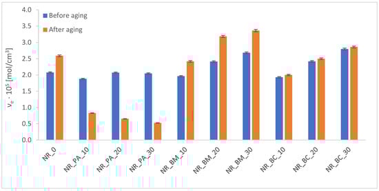 During service, rubber products are subjected to a variety of environmental factors that contribute to their degradation. Elevated temperatures and ultraviolet radiation initiate the aging processes in rubber vulcanizates; therefore, it is essential to examine how various factors—such as modifications in the composition of rubber mixtures—affect the material’s resistance to these processes. The effects of aging were evaluated by analyzing changes in selected functional properties of the tested materials, including crosslink density (Figure 2), mechanical properties (Figure 3), hardness (Figure 4), and the contact angle of the vulcanizates (Table 7) following thermo-oxidative aging.