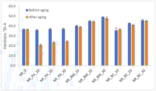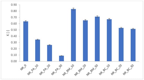 The resistance of vulcanizates to aging is quantified by the aging coefficient K. A value of K approaching unity indicates a higher resistance to aging processes, as it reflects smaller changes in the mechanical properties of the vulcanizates. According to the calculated K values presented in Figure 3, thermo-oxidative aging exerted a variable impact on the degradation of the vulcanizates. This finding is corroborated by the observed effects on the cross-linking density of the composites. Moreover, both mechanical testing and hardness after aging revealed that composites incorporating biochar and wood biomass experienced the least degradation, whereas those containing phyto-ash exhibited the most significant deterioration.