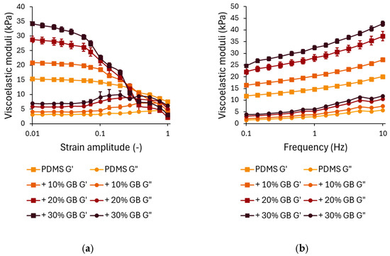 (a) Strain-dependent rheological behavior of PDMS composites with varying glass bead (GB) concentrations. Storage modulus (G′) and loss modulus (G″) as functions of strain amplitude, showing a decrease in modulus at higher strains, characteristic of strain softening. The presence of glass beads enhances the initial stiffness. (b) Frequency-dependent rheological response of PDMS-GB composites. Storage modulus (G′) and loss modulus (G″) as functions of oscillation frequency, demonstrating increased stiffness and energy dissipation with increasing GB concentration. Error bars represent standard deviations.