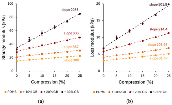 The compression-dependent rheological properties of PDMS GB composites were evaluated through storage modulus (G′) and loss modulus (G”) measurements. Under increasing compression, all composites exhibited an increase in G′, confirming the compression-stiffening effect. The pure PDMS sample showed a relatively low stiffening rate, increasing by approximately 52% at 25% compression. However, the 10%, 20%, and 30% GB composites exhibited significant increases of 72%, 91%, and 125%, respectively, demonstrating that the presence of rigid inclusions enhances the mechanical reinforcement of the matrix.