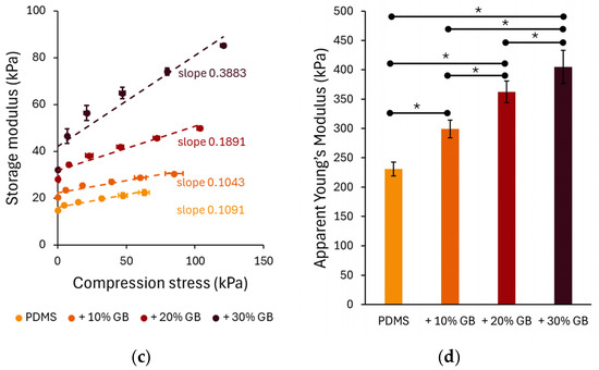 Compression-dependent rheological behavior of PDMS GB composites. (a,b) Storage modulus (G′) and loss modulus (G″) as functions of applied compression, showing a progressive increase with glass bead content. The slopes indicate the rate of modulus increase, highlighting the compression-stiffening effect. (c) Storage modulus as a function of applied compressive stress, revealing a nonlinear stiffening response with increasing stress. (d) Apparent Young’s modulus of PDMS composites, demonstrating a significant increase in stiffness with higher glass bead concentrations. Error bars represent standard deviations. Asterisks (*) denote statistically significant differences between groups (post hoc Tukey, p < 0.05).