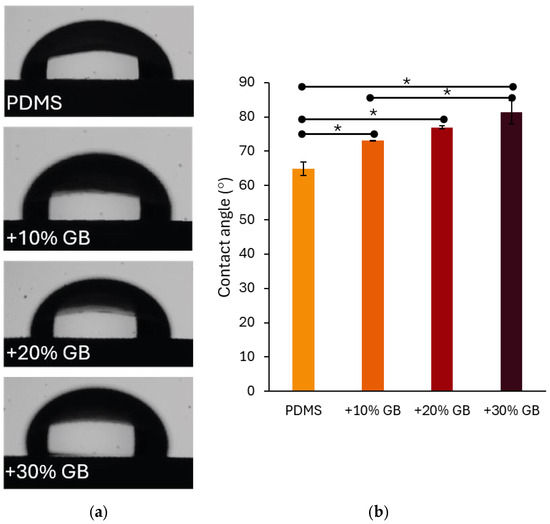 (a) Contact angle measurements of water droplets on PDMS surfaces with varying glass bead (GB) concentrations. The presence of glass beads alters the surface wettability, increasing hydrophobicity. (b) Quantitative analysis of contact angle values for pure PDMS and composites with 10%, 20%, and 30% GB content. The contact angle increases with higher GB concentrations, indicating a significant shift in surface properties. Asterisks (*) denote statistically significant differences between groups (post hoc Tukey, p < 0.05).