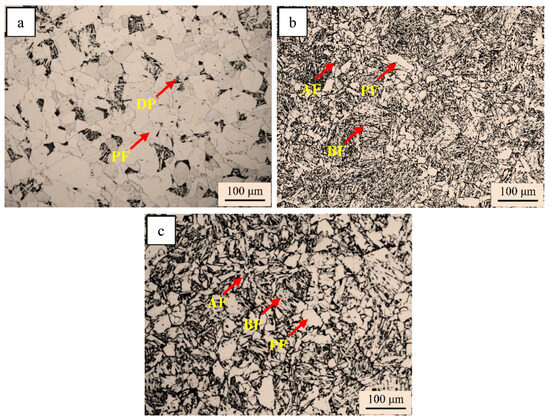 The optical micrographs of the simulated samples with different chemicals are shown in Figure 2. In addition, the quantification results of the microstructure in the simulated samples are provided in Table 1. The simulated steel A sample was composed of abundant PF and DP (Figure 2a). Compared with the simulated steel A sample, the DP disappeared, the PF reduced, and AF and GB appeared in the steel B simulated sample (Figure 2b). The microstructure of the steel C sample consisted of a mass of PF and AF and a little of GB.