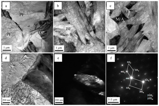 The TEM micrographs of the simulated samples are provided in Figure 3. There were DP and PF with low-density dislocations in the simulated sample of steel A, while the microstructure of the simulated steel B sample was mainly composed of AF, BF and M/A constituents with the shape of islands. The microstructure of the simulated steel C sample consisted of fine AF, a finer BF and some M/A constituents. Moreover, the M/A constituent was confirmed using the bright field image (Figure 3d), dark field image (Figure 3e) and electron diffraction image (Figure 3f).
