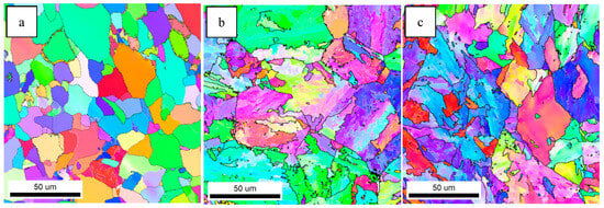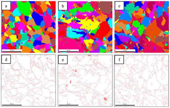 Previous studies have shown that high-angle grain boundaries (HAGBs) can inhibit crack propagation and improve the impact toughness of steel. The crystallographic information of the test steels was characterized by EBSD. Figure 4 shows the inverse polarity diagrams of the simulated samples. According to the misorientation tolerance angle (MTA) between the adjacent grains, the grain boundaries are classified as low-angle grain boundaries (LAGBs) (MTA < 15°) and HAGBs (MTA ≥ 15°), which are distinguished by white and black lines, respectively.