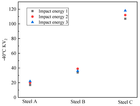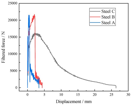 The impact test results of the simulated samples at −40 °C are exhibited in Figure 6. The impact energies of the steel A, steel B and steel C samples were 20 J, 35 J and 111 J, respectively. The impact toughness of the CGHAZ for the test steels was considerably improved when Mo and B were added at the same time. Figure 7 presents the force–displacement curves of the simulated samples at temperatures of −40 °C. The crack initiation energy (Ei) and crack propagation energy (Ej) were obtained from the areas enclosed to the left and right of the highest point, respectively. The total impact energy (Et), Ei, and Ej are shown in Table 2.