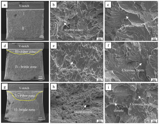 The morphology features of the fracture surfaces of the steel A, steel B and steel C samples at −40 are shown in Figure 8. Figure 8a,d,g present the macroscopic fracture morphology of the steel A, steel B and steel C samples, respectively. There is little fiber zone in the steel A sample, while the fiber area percentage of the steel B sample is about 9%. Steel sample C presents a maximum fiber area of 36%.