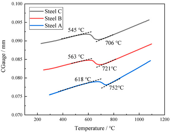 The morphology of ferrite is related to the phase transition temperature. PF is formed at a high temperature, and acicular ferrite and lath ferrite are formed at relatively low temperatures [12]. Figure 9 shows the expansion curves and phase transition temperatures of the three test steels during cooling. The phase Ar3 of test steel A was 752 °C, and the phase transition temperature was relatively high. When cooling to 650 °C, the phase transition was basically completed before entering the acicular ferrite transformation range for steel A. PF is a diffusion phase transition transformation controlled by the diffusion and migration of solute atoms near the phase interface [21,22]. The carbon atoms are fully diffused at a relatively high temperature and the growth rate of the ferrite is independent of the grain boundary orientation. Therefore, the main microstructures consist of PF in the A steel. When large-sized PF is formed at a high temperature, the ferrite emits more carbon, and the carbon elements gather into the untransformed austenite. With further reduction in temperature, the austenite with higher carbon content is transformed into large-sized degenerate pearlite. As a result, the microstructure of test steel A is PF and DP.