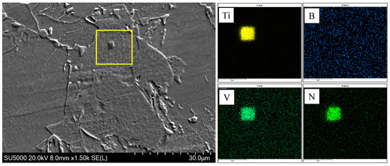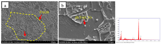 Figure 9 indicates that there was little difference in the transition temperature interval between test steel B and test steel C. However, there was a large amount of AF and only a small amount of GB in steel C, which could be attributed to the element B. During the cooling process, B tends to segregate at the original austenite grain boundary [26,27,28,29]; the B content near the grain boundary increases and combines with the N element to precipitate on the Ti(C,N) to form (B,Ti)(C,N), and the (B,Ti)(C,N) particles at the grain boundary provide nucleation sites for the ferritic nucleus, so that more ferrite is preferentially formed at the grain boundary, as shown in Figure 10. The formation of ferrite preferentially occupies the austenite grain boundary and thus inhibits the transformation of bainite. At the same time, there are numbers of precipitated (V,Ti)(C,N) and (B,Ti)(C,N) particles in the austenite grain to provide nucleating sites for the ferrite (Figure 11 and Figure 12), which can promote the formation of intragranular ferrite. For steel B, GB firstly nucleated at the grain boundaries instead of the AF nucleated on the precipitates, and the GB grew rapidly into the grain [30], which inhibited the AF transformation. Therefore, GB was the dominant microstructure in steel B.