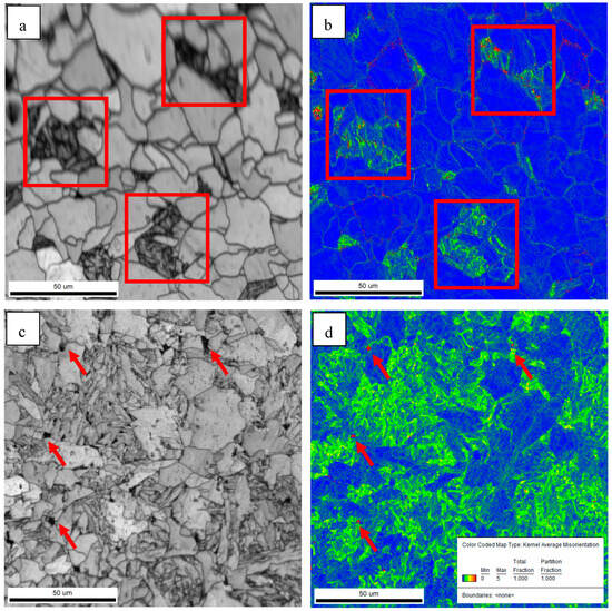 Band contrast maps and KAMs of steel A sample (a,b) and steel C sample (c,d).