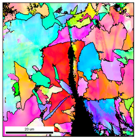 In the Figure 16, the black line represents the grain boundary with an orientation angle higher than 15° (high-angle grain boundary). The crack goes straight through in the grain, indicating that the low-angle grain boundary cannot hinder the crack propagation. Passing through the high-angle grain boundary, the cracks turn and narrowed in width, and finally stop at the HAGB. The HAGB can hinder crack propagation [34,35]. Grain refinement occurs when the microstructure of the simulated sample changes from GB to AF, and the effective grain size decreases from 7.9 μm to 4.2 μm. Therefore, the steel C sample has a stronger ability to hinder the crack propagation than the steel B sample, and more energy is consumed when the crack propagates in the acicular ferrite sample. Therefore, the crack propagation energy of the acicular ferrite sample is higher than that of the massive ferrite sample.