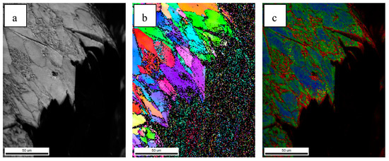 EBSD characterization of main crack of steel C simulated sample: (a) IQ, (b) IPF, (c) KAM.