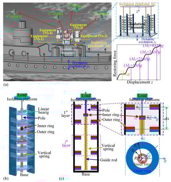 (a) An isolation platform applied in low-frequency and large-amplitude vibration environments, required to be appropriate for variable loads for bearing multiple groups of equipment; (b) The proposed ML-QZS vibration isolation mount constructed with Multi-layer magnetic rings; (c) The structural diagram of the ML-QZS isolation mount and the structural parameters of magnetic rings.