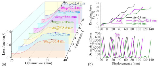 where λ is the weightiness and ΔM and LQZS are defined as Eqiations (6) and (9). Figure 3a gives the optimum values disopt for different weightiness λ from 1 to 8. As weightiness coefficient λ is larger than 4, the range of the QZS property is predominant and the optimum distance of the double magnetic rings is disopt = 32.4 mm. Figure 3b shows that the comparisons of restoring force FR and dynamic stiffness KR are among the cases for the optimum structural parameter and two other values as fixing the weightiness λ = 5. From the comparison, the variation-step of the load is the smallest and the QZS range is widest for disopt.