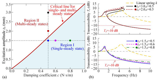 From Equation (16), the boundary of excitation amplitude z0 and damping coefficient c for single- or multi-steady states around the resonance is shown in Figure 4a for disopt = 32.4 mm. In Region I, there is only a single-steady state around the resonance, while in Region II, the multi-steady states occur. Increasing the damping coefficient c would raise the excitation amplitudes. Figure 4b shows the amplitude-frequency curves with the double-ring design for different parameters fixed in Region I and II. By comparison with the linear spring, the proposed QZS design by double magnetic rings has much lower effective isolation initial frequency and achieves the low-frequency isolation, which displays the advantages of the proposed nonlinearity. The system is stable if the excitation amplitude does not exceed the critical excitation amplitude. However, for the existence of multi-steady states, the vibration amplitude would jump to a large amplitude, which is the disadvantage of nonlinearity. Fortunately, as shown in Figure A2 in Appendix C, with the comparison of Region I between single magnetic ring (proposed in Ref. [17]) and double magnetic-ring designs, the proposed double-ring QZS isolator has a larger range for excitation amplitude for the single-steady state. Additionally, more comparisons of the isolator’s performance for different QZS isolators are shown in Appendix C, which verifies the advantages of the double-ring design principle for the wide-amplitude QZS property.