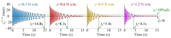 As shown in Figure 5, the envelope curves described by Equation (21) can obtain the effective vibration transient time, which obviously decreases with the increase of damping coefficient c. However, it is known that larger damping would worsen the isolation effectiveness in the high-frequency band. Thus, the optimization criterion for coordination of transient vibration attenuation and isolation effectiveness is needed in the high-frequency band.