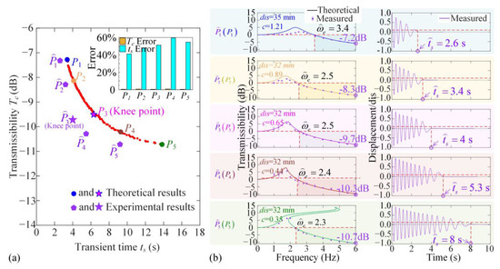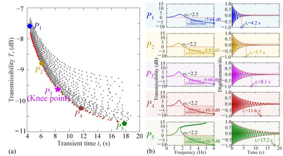 Figure 6 shows the feasible index solution that ts and vary for different values of c and dis, marked with grey points. According to Equation (22), if there is no value of , so that F(μ) < , then is the Pareto index solution and the parameter set is called the Pareto front, as shown with red points in Figure 6a. All points for the Pareto front meet the design requirement for dynamic performance optimization. However, the variations of the two dynamic objectives, transient time ts and transmissibility at high-frequency Te, are contradictory, so the Knee Point is selected from all Pareto front points for coordination of the two indices. Figure 6b shows the transmissibility curve and the vibration transient at five Pareto front points from P1 to P5. Defining the Knee Point as the one with the longest distance from the line across the two edge points P1 to P5, we figure out that P3 is the optimization indices for dynamic performances. At the Knee Point P3, where dis = 32.2 mm and c = 0.64, the displacement transmissibility at 6 Hz is −9.68 dB, indicating that the vibration excitation is reduced to about 10% under continuous base excitation. Additionally, the vibration is effectively attenuated at 8.1 s as the system transitions from the upper layer to the lower one as the loading increases ΔM.