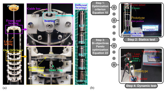 The experimental processes are constructed as shown in Figure 7b, typically consisting of four Steps. Step 1 is the structural design of the double-layer magnetic rings for the widest range for the QZS property and the smallest variation for different loads according to the optimization criterion (10). Step 2 is the static testing verification for the variation loading and range for the QZS property, which can provide the prediction for the excitation amplitude range for the single-steady state and avoid the jumping phenomenon. Step 3 involves optimizing the linear bearing and structure using the bio-objective optimization criterion (23). Step 4 is the dynamic testing verification for the dynamic performances including the transient vibration attenuation at the adjacent layer for increasing the loading and the vibration isolation effectiveness in one double-ring QZS layer. In the dynamic testing, the base excitation is generated by the exciter (VE-5110, Yiheng Technology Co., Ltd., Hangzhou, Zhejiang, China), which is driven by a signal generator (ECON-MI8008, Yiheng Technology Co., Ltd., Hangzhou, Zhejiang, China) with a power amplifier (ECON-H181A, Yiheng Technology Co., Ltd., Hangzhou, Zhejiang, China). The vibration frequency and amplitude of the exciter are controlled using the software (TestEngineX 4.2.40) of the signal generator. In this paper, the vibration amplitude is set to 1.2 mm for all dynamic tests. Two laser sensors (KathMaticKVD-4525L, KathMaticKVD-4525S, KathMatic Technology Co., Ltd, Nanjing, Jiangsu, China) are placed to estimate the absolute vibrations of the base and the isolation platform in the time domain, respectively. Then, the data, measured using laser sensors, are collected and sent to the computer, and analyzed using the signal processing software to obtain the amplitude.
