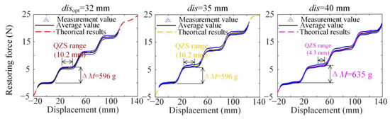 According to the optimization criterion of the structural design in Equation (10), the vertical positive-spring stiffness is k = 0.196 N·mm−1 and the optimum value of dis is disopt = 32.0 mm. In order to show the comparison of the QZS range and loading variation for different values of structural parameter dis, we construct other three prototypes with disopt = 32 mm, dis = 35 mm, and dis = 40 mm. Then, through quasi-static testing using the tensile testing machine, the restoring forces FR for different disopt are obtained as shown in Figure 8. For the disopt, the initial load mass is M0 = 238.6 g, with 10.2 mm QZS range and variation load ΔM = 596 g. While for the cases dis = 35 mm and dis = 40 mm, the loading variations are both larger and the QZS ranges are both narrower compared to the optimum case.