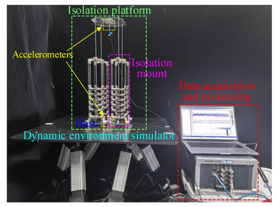 In the dynamic experiment for the isolation platform with optimization structural parameters, the isolation performances are demonstrated by three experiments as shown in Figure 11. The first experiment is to show the vibration attenuation effect for adding multiple equipment, the second is to show the isolation effect in different layers for low-frequency excitation, and the third is to show the vibration suppression effect for low-frequency excitation and adding load simultaneously.
