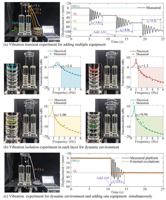 Finally, as shown in Figure 11c, the vibration suppression effectiveness when simultaneously applying low-frequency base excitation and variable loads demonstrated. As the base excitation z0cos ωt with z0 = 1.2 mm and ω = 3 Hz, for t ranging from 0 s to 11 s, the absolute vibration amplitude of the isolation platform is 50% smaller than z0, as verified by the displacement transmissibility curves shown in Figure 11b as T = −3 dB. When applying the ΔMg at t = 10.5 s, the vibration equilibrium drops from O1 to O2 in the second layer. The vibration attenuation time is ts = 3.9 s and the vibration amplitude of the isolation platform is smaller than the excitation amplitude as T = −10 dB for t from 14.5 s. The corresponding videos are shown in Video S2.