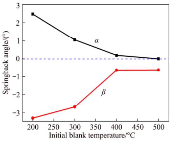 Wang et al. [51] analyzed the springback of AA5754 using experiments and finite element simulations, concluding that springback increases with the tangential stress gradient. Ma et al. [52] experimentally investigated the springback behavior of 6016 aluminum alloy during hot stamping using a V-die test. The measurement method is shown in Figure 5, As shown in Figure 6, the springback angle exhibits strong temperature dependence, decreasing significantly within the 200–400 °C range but showing minimal variation between 400 and 500 °C. The researchers validated these experimental findings through finite element modeling (Figure 7), with the simulation results demonstrating good agreement with experimental measurements (Table 1). Furthermore, springback is significantly influenced by mold parameters [53,54]. An increase in the angular radius of the grinding tool leads to a higher springback angle. Although the HFQ® process significantly reduces springback, slight springback persists after unloading the thermoformed parts. Zhou et al. [55] analyzed the springback behavior of 7075 aluminum alloy thermoforming at 25–400 °C by experiment and finite element simulation, and effectively predicted the springback angle change.