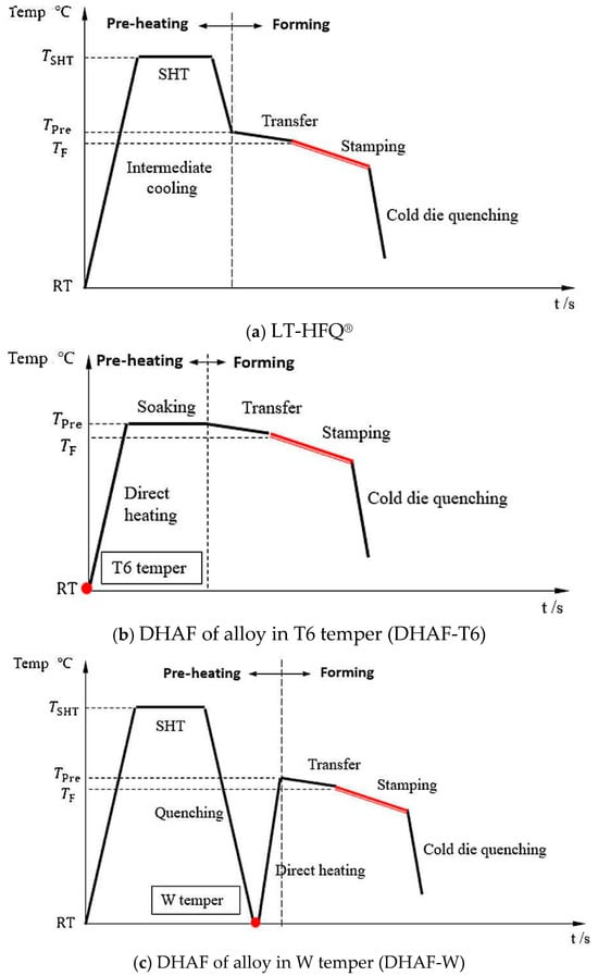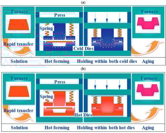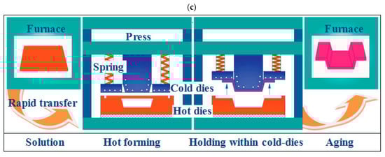 Schematic diagram of the integrated thermoforming–quenching process using (a) double cold die, (b) double hot die, and (c) hot and cold die [62].